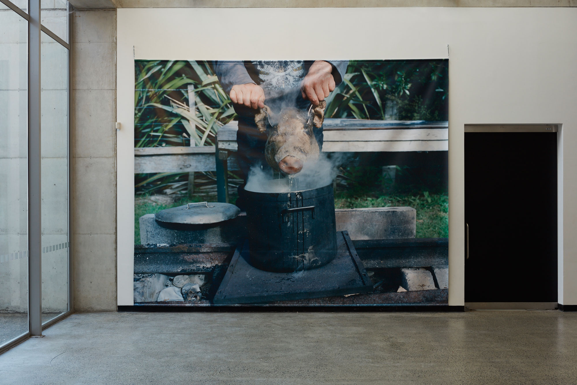 Natalie Robertson, Boiled pig head, Te Rimu, Tikapa, 2012. PVC print. Photo: Sam Hartnett.